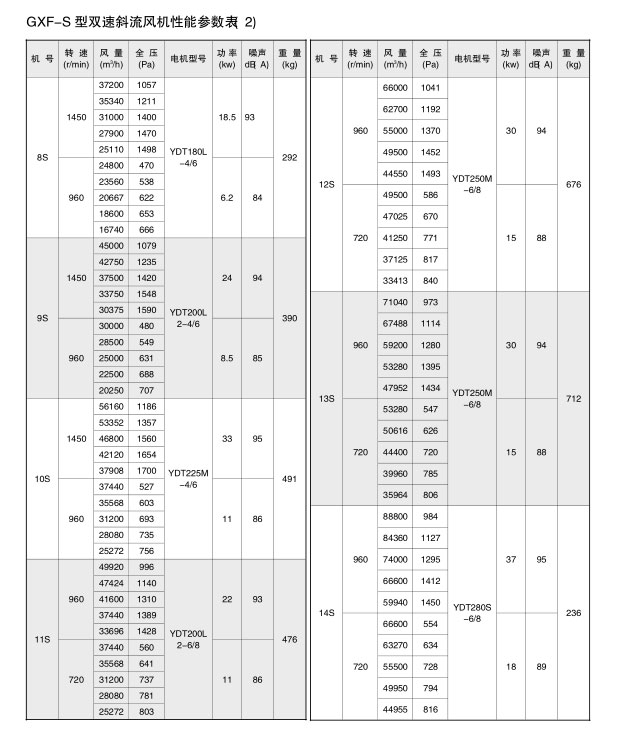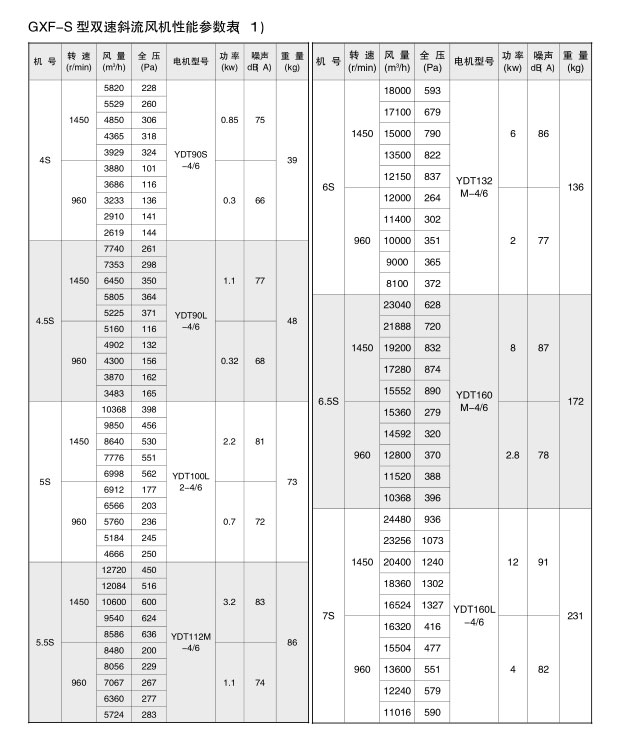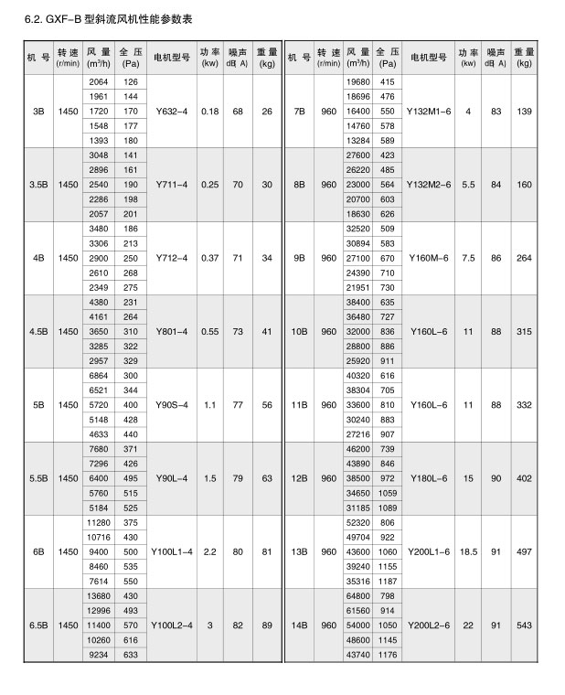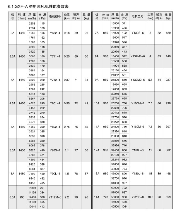 GXF系列斜流通風(fēng)機按葉輪直徑分為400-1400mm十四規(guī)格,按類型分為A、B、C、S四種類型,共五十八個機號。風(fēng)量由3000-90000m3/h,全壓由185-2500Pa;這樣就給設(shè)計部門和用戶單位提供了充分的選擇條件,具體數(shù)據(jù)請查風(fēng)機性能參數(shù)表。