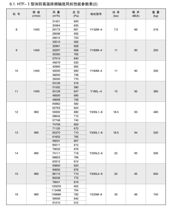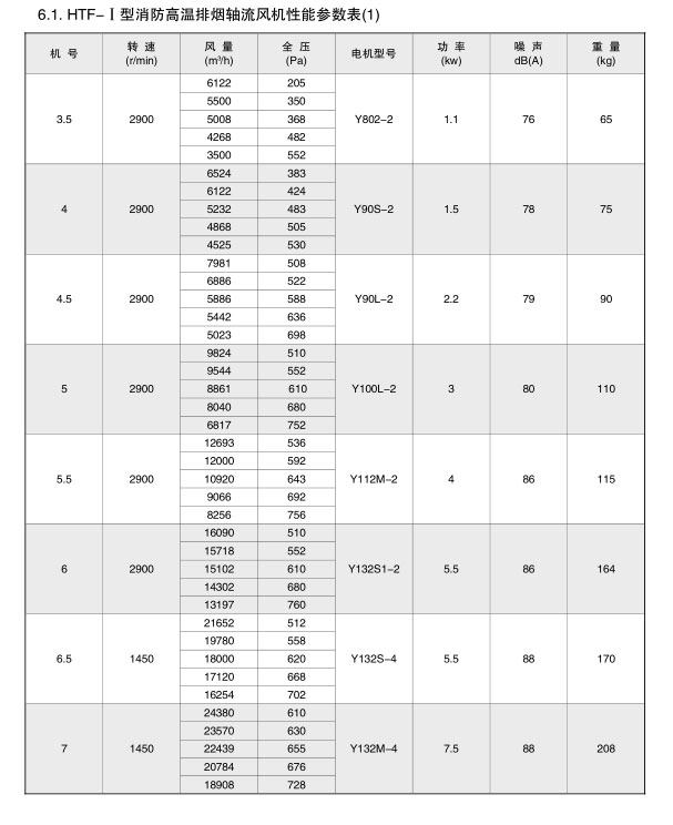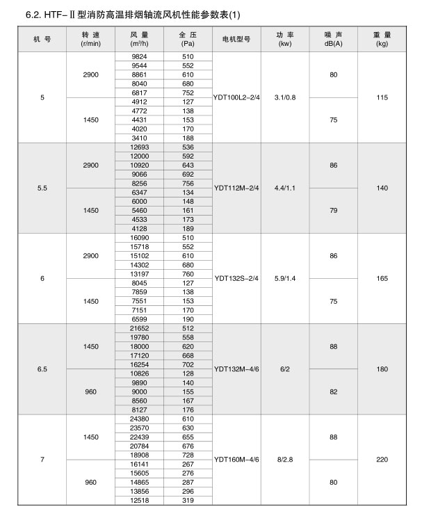 例:HTF—SX№5代表消防排煙軸流風機配雙速電機和消聲器,葉輪直徑500mm。